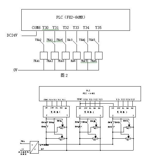 變頻器1﹑2﹑3分別控制電機M13﹑M14﹑M15,主回路接線圖略。PLC為FX2-64MR。FMA﹑11是來自灌裝機變頻器0~10V的輸出信號,經過信號隔離器的轉換作為變頻器1﹑2﹑3的控制信號。圖中KA1-6為輔助繼電器。W1-6為分壓電位器。PLC的輸入端子略。FMA﹑11是來自灌裝機主機變頻器的輸出信號。兩圖中的PLC為同一PLC,圖2中的COM6接DC24V電壓,控制輔助繼電器。