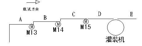 根據工藝要求,灌裝機前面的輸送帶分成若干段。A﹑B﹑C﹑D﹑E為輸送帶,M13﹑M14﹑M15分別為A﹑B﹑C帶的拖動電機。D帶與灌裝機機械聯動,E帶由另一電機拖動。另外,各帶上均有光電傳感器探測瓶流速度。PLC根據瓶流調整各段輸送帶的速度。